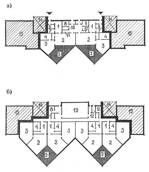 1 - раздевальная; 2 - групповая; 3 - спальня; 4 - туалетная; 5 - открытая терраса; 6 - колясочная; 7- кладовая; 8 - комната персонала; 9 - медицинская комната; 10 - туалет персонала; 12 - загрузочная и моечная термоконтейнеров; 13 - зал для музыкальных и гимнастических занятий; 14 - лестнично-лифтовые площадки жилых зданий; 15 - жилые или нежилые помещения первых этажей жилых зданий, оставшиеся не занятыми групповыми отделениями в пределах секции