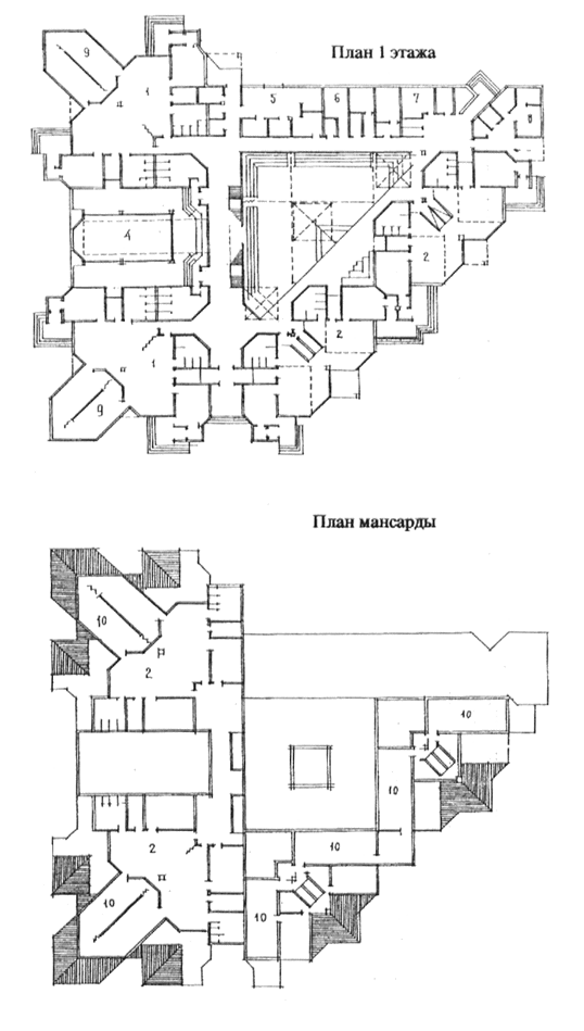 1 - помещения групп детей ясельного возраста; 2 - помещения групп детей дошкольного возраста; 3 - зал для музыкальных и гимнастических занятий; 4 - бассейн; 5 -кухня; 6 - постирочная; 7 - помещения администрации; 8 - медицинские помещения; 9 - остекленные веранды ясельных групп; 10 - остекленные веранды дошкольных групп