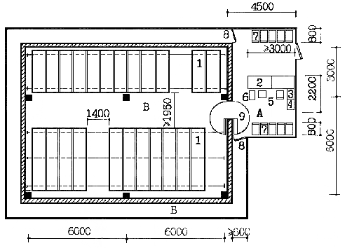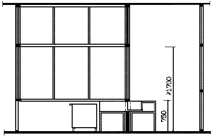 | 3 - тумба | 9 - решетчатые перегородки с запирающимися дверьми /для выделения зон в кладовой/ |