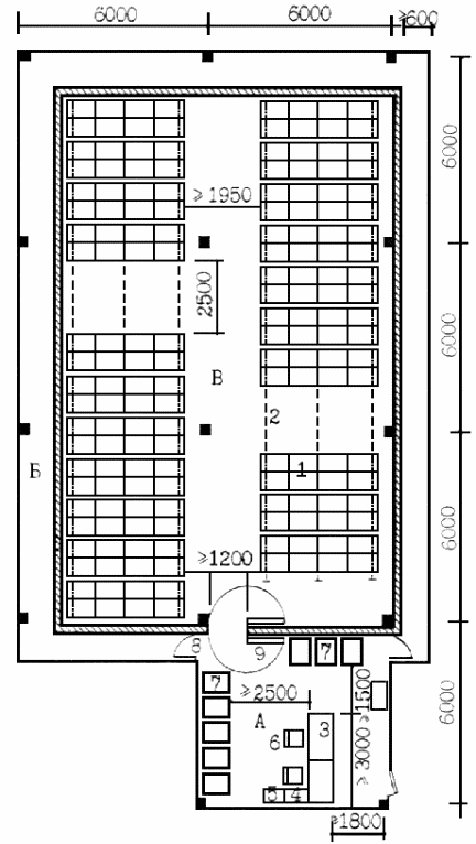 | 1 - стационарные металлические стеллажи с решетчатыми дверцами | 7 - решетчатая металлическая дверь |