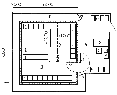 | В - кладовая ценностей | 6 - закрытые тележки /передвижные сейфы/ для транспортировки денег |