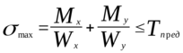 где Тпред — расчетное сопротивление стержня при изгибе; Мx и My — изгибающие моменты относительно главных осей х и y сечения стержня; Wx и Wy — моменты сопротивления сечения стержня при изгибе относительно этих осей.