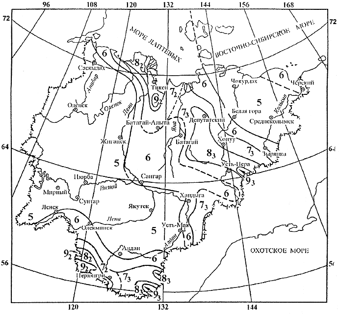 КАРТА СЕЙСМИЧЕСКОГО РАЙОНИРОВАНИЯ РЕСПУБЛИКИ (САХА) ЯКУТИЯ, 1996 г.