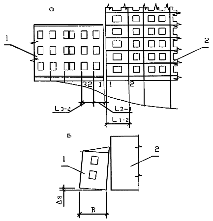 ) в наземной части между новыми и существующими зданиями (сооружениями) должна определяться расчетом с учетом крена существующего здания в сторону проектируемого (в результате развития дополнительной осадки уплотнения) и его высоты. Креном нового здания, который обычно направлен в сторону от существующего (в запас), можно пренебречь.