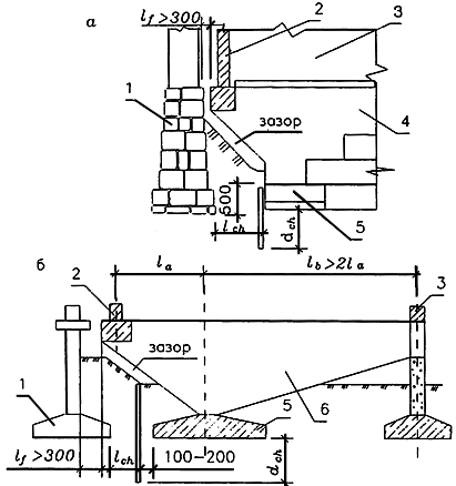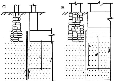 а) глубина котлована dk меньше или равна глубине заложения существующего фундамента drf при (drf - dk) < 0,5 м и lch < 1,5 drf, где lch - расстояние между существующим и новым фундаментом (при (drf - dk)