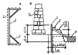 3.7.34. Для обеспечения минимального горизонтального перемещения шпунта 1 (рис. 3.21), ограждающего строительный котлован, и подпорных стенок (см. разд. 3.9) в период строительства рекомендуется назначать их временное крепление с установкой обвязочных балок 2 и подкосов 3. При назначении подкосов, упертых в новые фундаменты (рис. 3.21,б), отрывку котлована на расстоянии