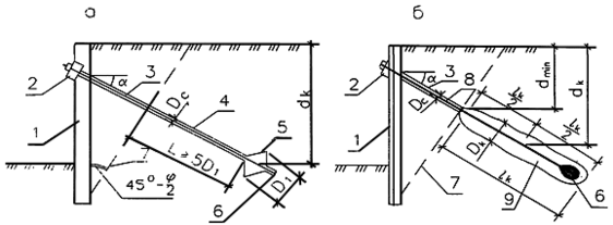 3.11.4. Анкеры подразделяются: по направлению тяги - наклонные и вертикальные; по способу образования скважин - буровые с проходкой скважин с обсадными трубами, под глинистым раствором, шнеком и с погружением обсадной трубы забивкой или вдавливанием; по способу устройства - инъекционные (скважина в зоне заделки заполняется цементным раствором под давлением), с разбуренным уширением и цилиндрические (скважина заполняется цементным раствором без избыточного давления); по материалу анкерных тяг - из стержневой и тросовой арматуры; по сроку службы - временные (до 2 лет) и постоянные.