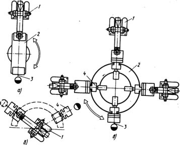 а—с двухпозиционным поворотным столом, б - с двумя манипуляторами изделия, в—с четырехпозиционным поворотным столом; 1 — сварочный робот, 2 - поворотный стол, 3 - позиция загрузки—разгрузки, 4 — манипулятор изделия