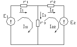 замыкающиеся в контурах. На рис.1.22. в виде примера показана двухконтурная цепь, в которой I11 и I22 - контурные токи. Токи в сопротивлениях r1 и r2 равны соответствующим контурным токам; ток в сопротивлении r3 являющемся общим для обоих контуров, равен разности контурных токов I11 и I22, так как эти токи направлены в ветви r3 встречно.