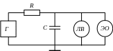 , сопротивления R, конденсатора С, лампового вольтметра ЛВ и осциллографа. Если конденсатор включен в цепь переменного тока, то его заряд в течение малого промежутка времени dt увеличится на dq, где dq = Idt. Ток I в цепи в общем случае зависит как от сопротивления R, так и от конденсатора С. Величина R подбирается настолько большой, что напряжение на сопротивлении много больше, чем напряжение на конденсаторе, т. е. выполняется условие R>>1/ωС, при котором влияние емкости на силу тока будет мало. В этом приближении с достаточно высокой точностью можно считать ток в цепи равным