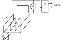 (рис. 3). Изменяют напряжение с помощью ЛАТРа (Л) (автотрансформатора), который вместе с трансформатором (Тр) находится внутри кожуха установки. Регулировку напряжения производят поворотом ручки, выведенной на переднюю панель корпуса. Измеряют напряжение на пластинах С киловольтметром (кВ). Изменение уровня жидкости и расстояние между пластинами определяются измерительным микроскопом М. В поле зрения измерительного микроскопа помещена шкала, ориентацию которой можно изменять. Для определения расстояния между пластинами шкалу располагают горизонтально; для определения изменения уровня жидкости при включении напряжения шкалу располагают вертикально. При измерениях следует иметь в виду, что изображение, даваемое окуляром, перевернутое.