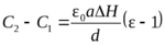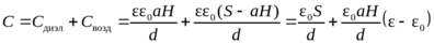 где С1 и С2 – емкости конденсатора до и после подъема жидкости на высоту H. Емкость конденсатора, частично заполненного диэлектриком, можно найти как емкость двух параллельно включенных конденсаторов, один из которых – с диэлектриком, другой – без него. Емкость такой системы равна