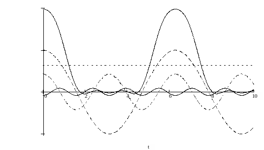 2)Для напряжения однополупериодного выпрямления построить на одном графике кривые мгновенных значений, соответствующие первым четырем слагаемым разложения в ряд Фурье, и их результирующую.