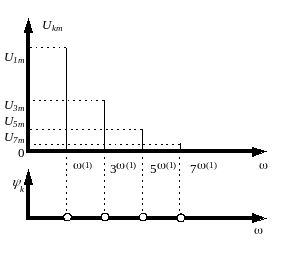 Построить амплитудный и фазовый спектры напряжения однополупериодного выпрямления.