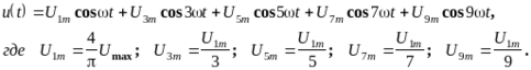 1)Записать ряды Фурье, ограничиваясь пятью слагаемыми, для напряжения U прямоугольной формы (меандра) и для однополупериодного выпрямленного синусоидального напряжения. Считать, что напряжения заданы кривыми, симметричными относительно оси ординат.