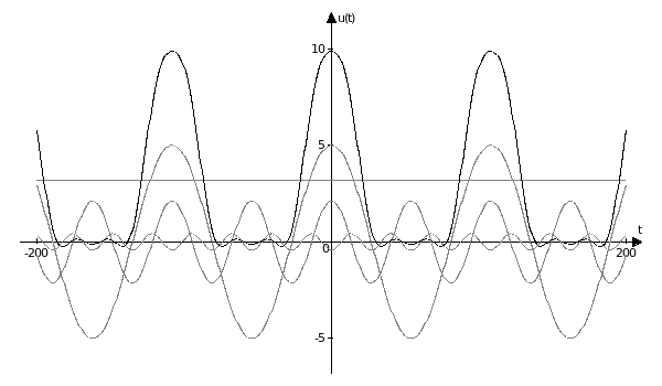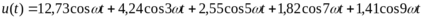 Кривые мгновенных значений первых 4-ех слагаемых ряда Фурье и их результирующая.