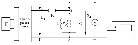 , добиваются совпадения резонансной частоты контура и частоты 2-ой гармоники напряжения на выходе преобразователя. Показание вольтметра V, подключенного к контуру, при этом достигнет максимального значения. Амплитуда