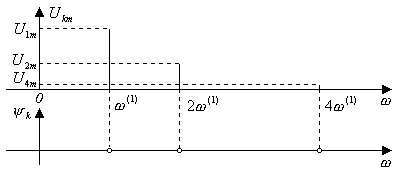 Амплитудный и фазовый спектры напряжения однополупериодного выпрямления.