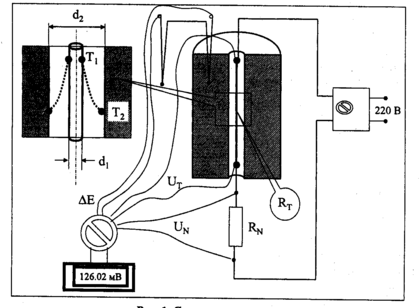Опытная установка состоит из массивного медного цилиндрического блока с аксиальным сверлением, в котором по оси натянута платиновая нить, нагреваемая электрическим током. Выделяющаяся Джоулева теплота переносится посредством теплопроводности через цилиндрический слой воздуха к медному блоку. Влияние свободной конвекции исключается выбором достаточно малого диаметра сверления и ограничением максимальной разности температур. Если зафиксировать какое-либо значение силы тока, то температура платиновой нити Т1 установится на определённом уровне, зависящем от теплопроводности того вещества, которое заполняет цилиндрическую прослойку между нагретой нитью и медным блоком. Измеряя температуру Т1, мы можем судить о теплопроводности вещества в зазоре. Теория теплопроводности даёт для рассматриваемой задачи о стационарной теплопроводности цилиндрического слоя следующую формулу: