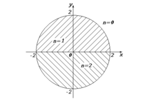 Разветвляющийся алгоритм можно продемонстрировать на примере решения следующей задачи. В компьютер вводятся значения переменных X и Y, представляющие собой координаты точки M(x, y) на плоскости xOy (смотри рисунок 1). Вся плоскость xOy разбита на три области, каждая из которых имеет признак n – номер от 0 до 2-х. Требуется разработать алгоритм и составить программу идентификации области, в которую попала точка M. Точки границ отнести к области с большим номером.Решение поставленной задачи может быть описано следующей последовательностью действий: