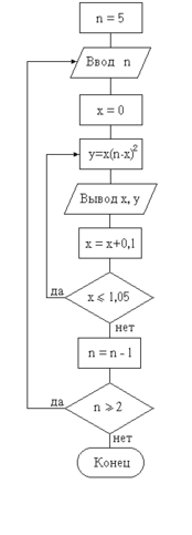 В отличие от рассмотренной выше задачи о расчете значений функции одной переменной построение таблиц функций двух переменных требует использования вложенных циклов. Так для вычисления значения функции y = x(n - x)2 для аргументов x = 0; 0,1; ...1,0 и n = 5; 4; 3; 2 блок-схема алгоритма и программа будут иметь вид: