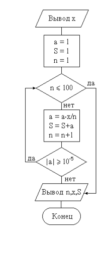 причем в качестве переменной цикла следует использовать номер члена ряда n, начиная с единицы. В качестве начального значения переменной S, в которой будет накапливаться сумма, следует установить единицу, так как первый член рассматриваемого ряда не подчиняется общей закономерности его формирования.