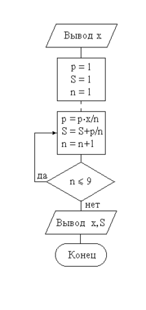 Данный алгоритм позволяет просуммировать первые десять членов заданного ряда. Ввод x производится с клавиатуры ЭВМ, а вывод результата – на экран монитора.123456789...................................