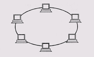 кольцо (ring), при которой каждый компьютер передает информацию всегда только одному компьютеру, следующему в цепочке, а получает информацию только от предыдущего в цепочке компьютера, и эта цепочка замкнута в «кольцо» (рис. 1.3).