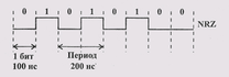 Самый большой недостаток кода NRZ - это возможность потери синхронизации приемником при приеме слишком длинных блоков (пакетов) информации. Приемник может привязывать момент начала приема только к первому (стартовому) биту пакета, а в течение приема пакета он вынужден пользоваться только собственным внутренним тактовым генератором. Если часы приемника расходятся с часами передатчика в ту или другую сторону, то временной сдвиг к концу приема пакета может превысить длительность одного бита или даже нескольких бит. В результате произойдет потеря переданных данных. Так, при длине пакета в 10000 бит допустимое расхождение часов составит не более 0,01% даже при идеальной передаче формы сигнала по кабелю.