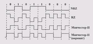 Код Манчестер-П, или манчестерский код, получил наибольшее распространение в локальных сетях. Он также относится к самосинхронизирующимся кодам, но в отличие от кода RZ имеет не три, а всего только два уровня, что способствует его лучшей помехозащищенности. Логическому нулю соответствует положительный переход в центре бита (то есть первая половина битового интервала - низкий уровень, вторая половина — высокий), а логической единице соответствует отрицательный переход в центре бита (или наоборот).