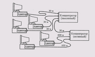 Максимальная длина кабеля между активным и пассивным концентраторами - 30 м.