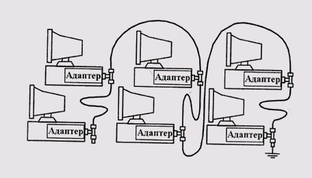 Активные концентраторы используются также и при создании топологии шина. В этом случае к каждому порту концентратора подключается сегмент шины с несколькими абонентами (не более 8). Минимальное расстояние между абонентами в шине составляет 1 м. Отметим, что для топологий шина и звезда применяются различные адаптеры (правда, существуют и адаптеры с возможностью работы как в шине, так и в звезде).