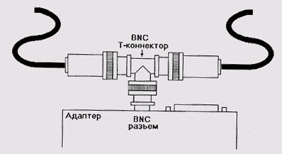 Кому-то может показаться удобным включить между разъемом адаптера и BNC Т-коннектором отрезок кабеля и расположить весь соединительный узел (Т-коннектор и два BNC разъема) подальше от адаптера и компьютера. В принципе это допускается, но стандарт определяет, что длина такого вставленного отрезка кабеля не должна превышать 4 см. Вряд ли кабель такой длины что-нибудь даст, поэтому лучше все-таки выполнять соединение именно так, как показано на рис. 8.5.