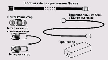 Для соединения кусков толстого коаксиального кабеля и присоединения к нему терминаторов используются разъемы так называемого N-типа, установка которых довольно сложна и требует специальных инструментов (в противном случае возможны искажения сигналов на стыках). Два разъема N-типа для увеличения длины кабеля могут соединяться с помощью Barrel-коннекторов.