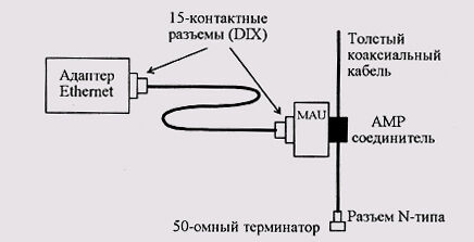 трансиверные кабели с 15-контактными AUI-разъемами на концах длиной от компьютера до толстого кабеля (по количеству сетевых адаптеров);
