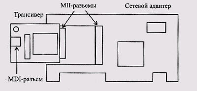 На плате трансивера располагается микросхема приемопередатчика и разъем, зависящий от типа среды (MDI - Medium Dependent Interface), например, RJ-45 для витой пары. Таким образом, один и тот же адаптер может поддерживать обмен с любым типом среды за счет простой замены сравнительно дешевого трансивера. Понятно, что в целом подобные составные адаптеры оказываются дороже обычных адаптеров со встроенными приемопередатчиками, но иногда их применение оправдано, если предполагается постепенная замена среды передачи, например, на оптоволоконные кабели.