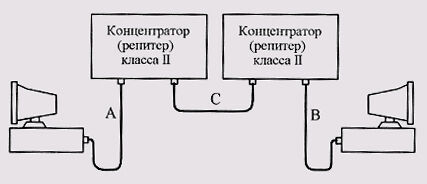 3. Соединение двух абонентов сети с помощью двух репитер-ных концентраторов класса II (рис. 10.6). При этом предполагается, что для связи концентраторов всегда используется электрический кабель длиной не более 5 м. Концентраторы класса II имеют меньшую задержку, поэтому их может быть два. Использование трех концентраторов не допускается в соответствии с моделью 1 ни в коем случае.