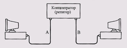 2. Соединение двух абонентов сети с помощью одного репитер-ного концентратора класса I или класса II (рис. 10.5).