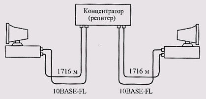 Возьмем простейшую конфигурацию сети из двух сегментов 10BASE-FL, соединенных концентратором (рис. 10.2).