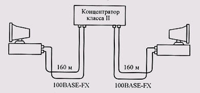 А теперь посмотрим, какова может быть максимальная величина сети Fast Ethernet. Для этого надо взять сеть с одним концентратором класса II и два сегмента 100BASE-FX. Элементарный расчет показывает, что при одинаковых сегментах длина каждого из них может достигать 160 метров (рис. 10.9), а общая длина сети составит 320 метров. Расчет двойного времени прохождения для этого случая будет выглядеть так: