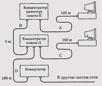 Пример сети максимальной конфигурации в соответствии с первой моделью для витой пары показан на рис. 10.7.