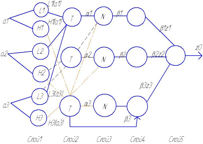 Все нейроны этого слоя обозначены буквой Т. Они могут реализовывать Т-норму для моделирования операции «и».