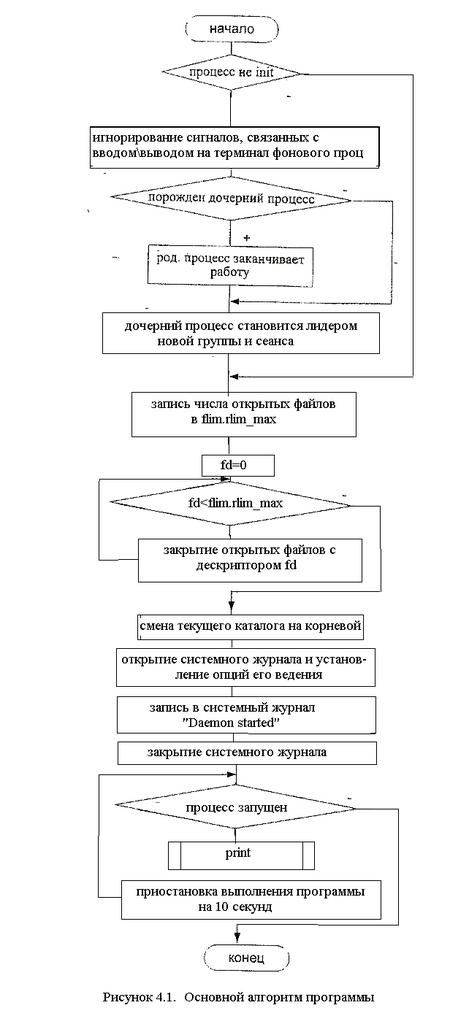 На рис. 4.1 приведен основной алгоритм яеинтерактивной программы. В ней вызываются функции, необходимые для выполнения программы, отслеживающей запущенные процессы. Данная функция организовывает собственную группу и сеанс, не имеющие управляющего терминала. Так как лидером группы и сеанса может стать процесс, если он еще не является лидером, а предыстория запуска данной программы неизвестна, необходима гарантия, что процесс не является лидером. Для этого порождает дочерний процесс. Так как его PID уникален, то ни группы ни сеансы с таким идентифика-
