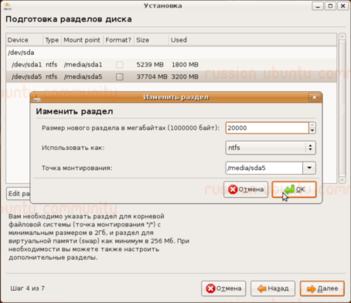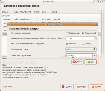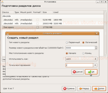 Создаём логический раздел, примерно 6Гб, файловая система ext3, в последнее поле вводим символ / - то есть, создаём корневой раздел.
