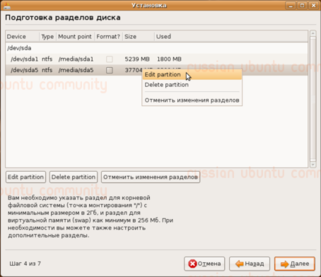 На следующем экране выберем раздел /dev/sda5 и отредактируем его: