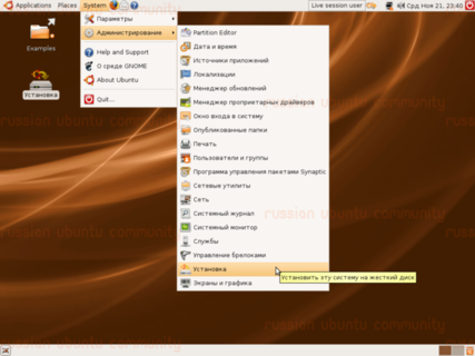 Перейдём непосредственно к установке. Программу установки можно запустить через меню System->Администрирование->Установка, либо с помощью ярлыка на рабочем столе.