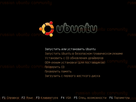 После проведения проверки и плановой перезагрузки, снова выберем русский язык и запустим систему с диска через пункт меню «Запустить или установить Ubuntu»: