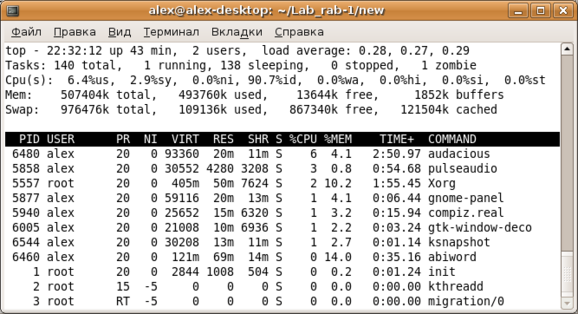 top - команда выдает непрерывно обновляемую таблицу всех задач, выполняющихся на компьютере, включая системные, с указанием объема используемых ресурсов. Для завершения работы команды необходимо нажать клавишу Q.