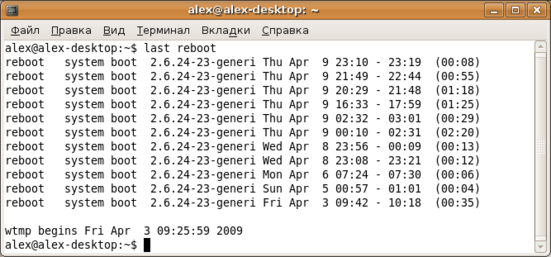 last [-ключ] - позволяет определить, кто и когда зарегистрировался в системе. Для выдачи результатов она пользуется файлом /etc/utmp, в котором зафиксированы моменты входа-выхода пользователей и перезагрузки системы. При использовании команды без параметров будет выведен список в обратном порядке всех, кто работал в системе. Для ограничения размера списка в качестве параметра следует указать некоторое число, например, команда last -25 выводит список последних 25 пользователей. Введя команду last reboot, можно просмотреть список последних загрузок