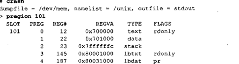 Как можно увидеть из вывода команды crash(), с рассматриваемым процессом связаны пять областей: сегмент кода, данных и стека, а также сегменты кода и данных подключенной библиотеки. Столбец reg# определяет запись таблицы областей, где расположена адресуемая каждой pregion область region. Заметим, что значение в столбце REG# лишь отчасти соответствует полю p_reg структуры pregion, поскольку последнее является указателем, а не индексом таблицы. Столбец regva содержит значения виртуальных адресов областей